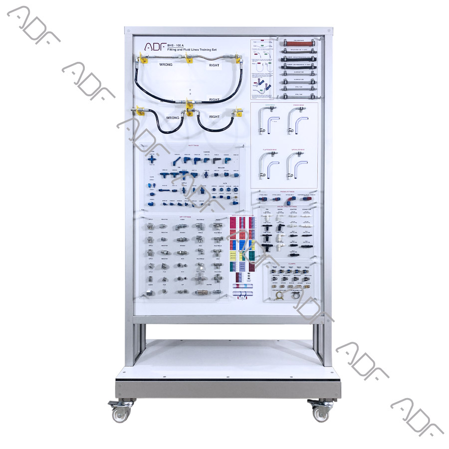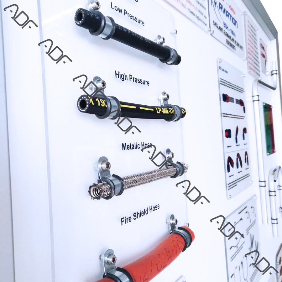 The Fluid Lines & Fittings Trainer Set demonstrates multiple types of fluid lines fittings and their assembly techniques. It displays the aircraft standard for assembling, routing, supporting fluid lines. Examples of frequently made mistakes are shown as well for trainees to avoid.
