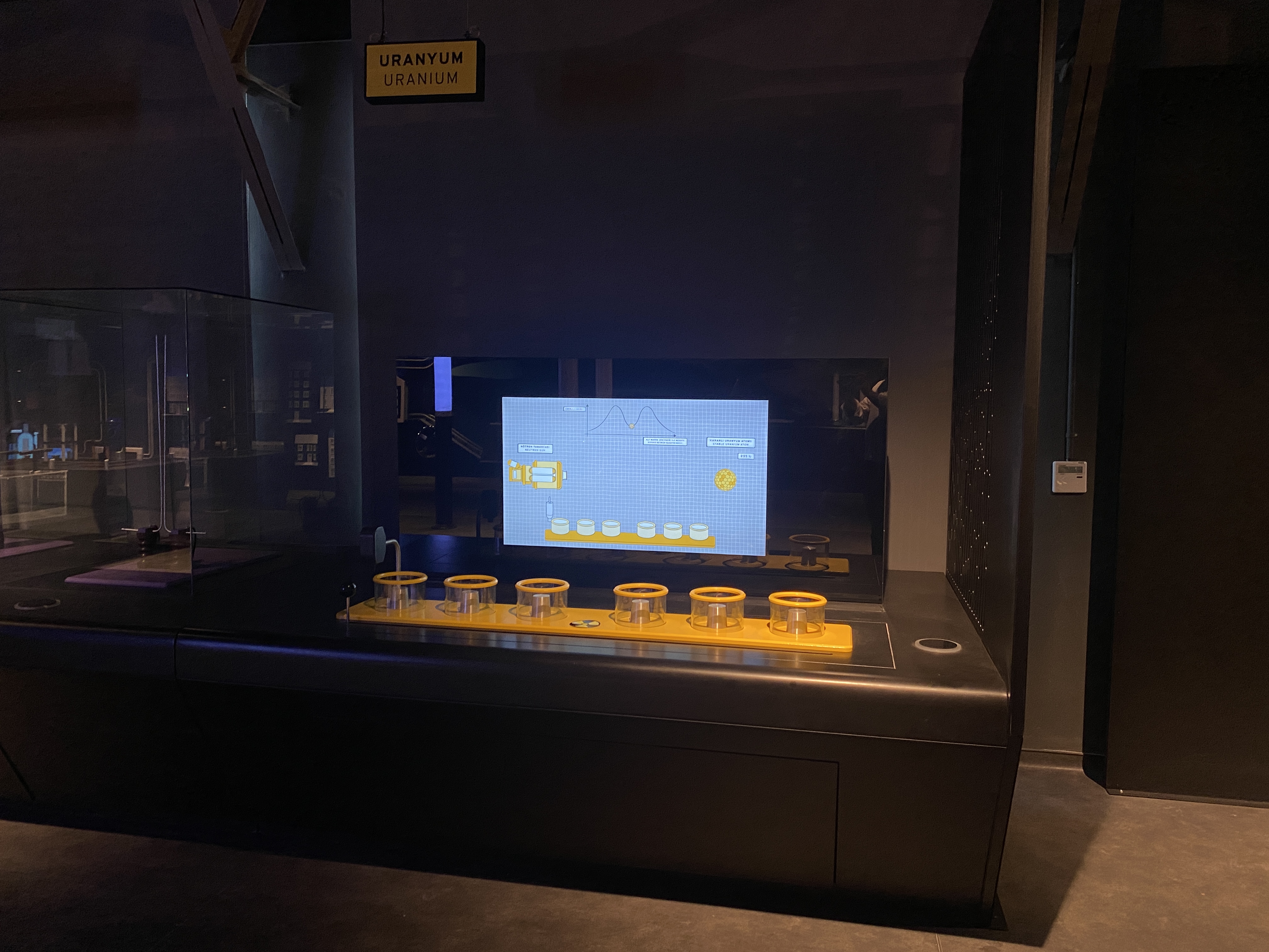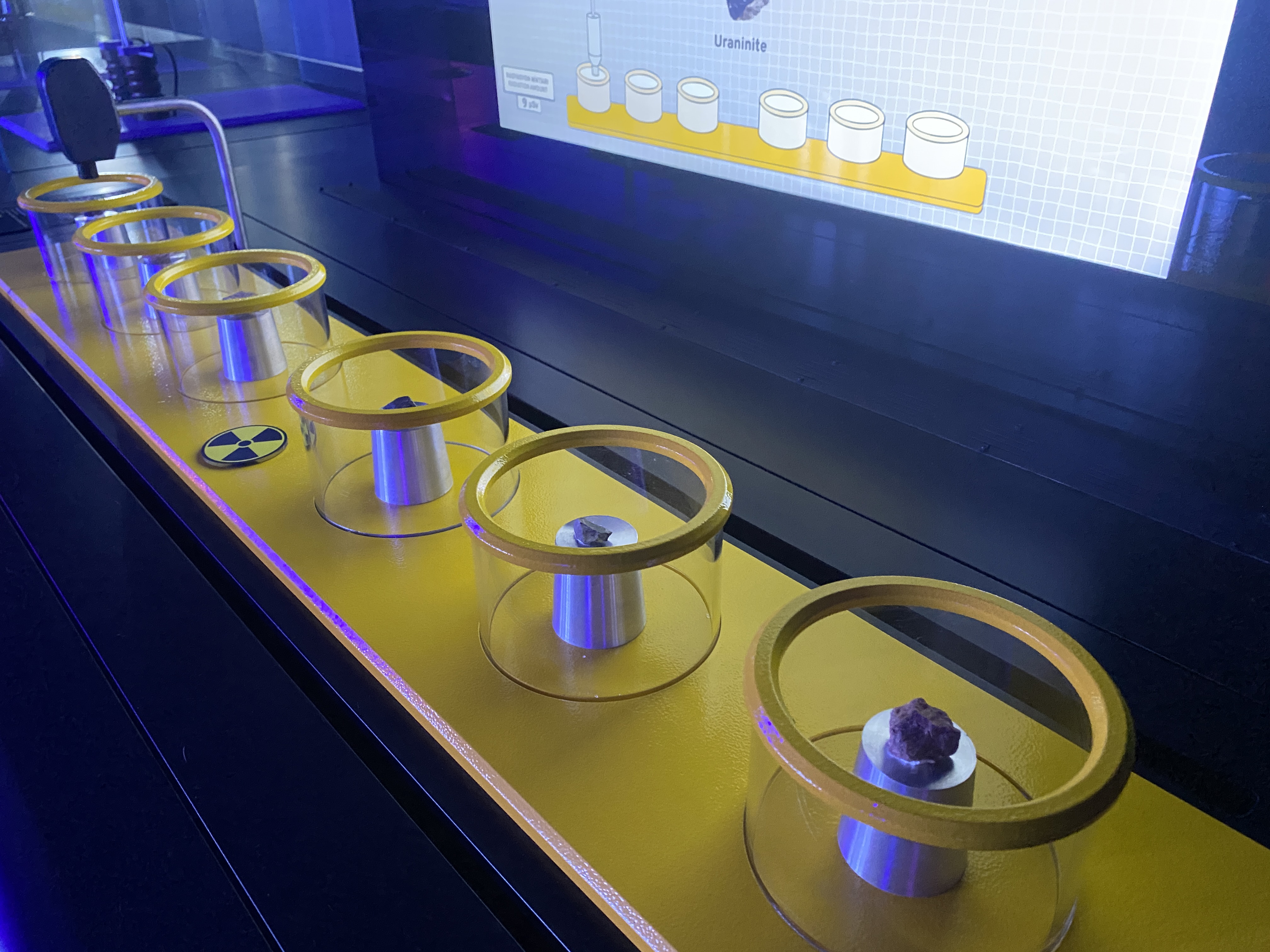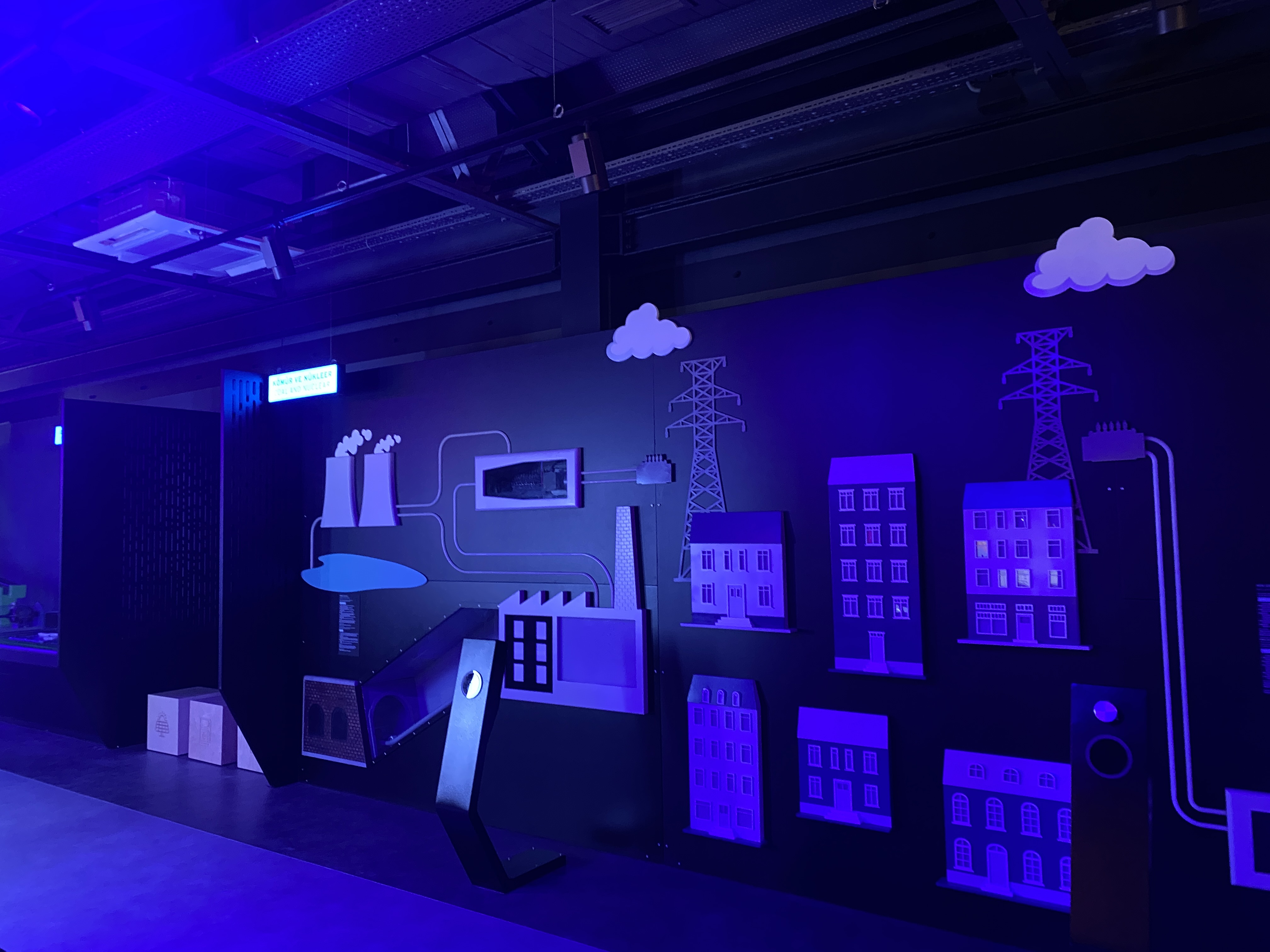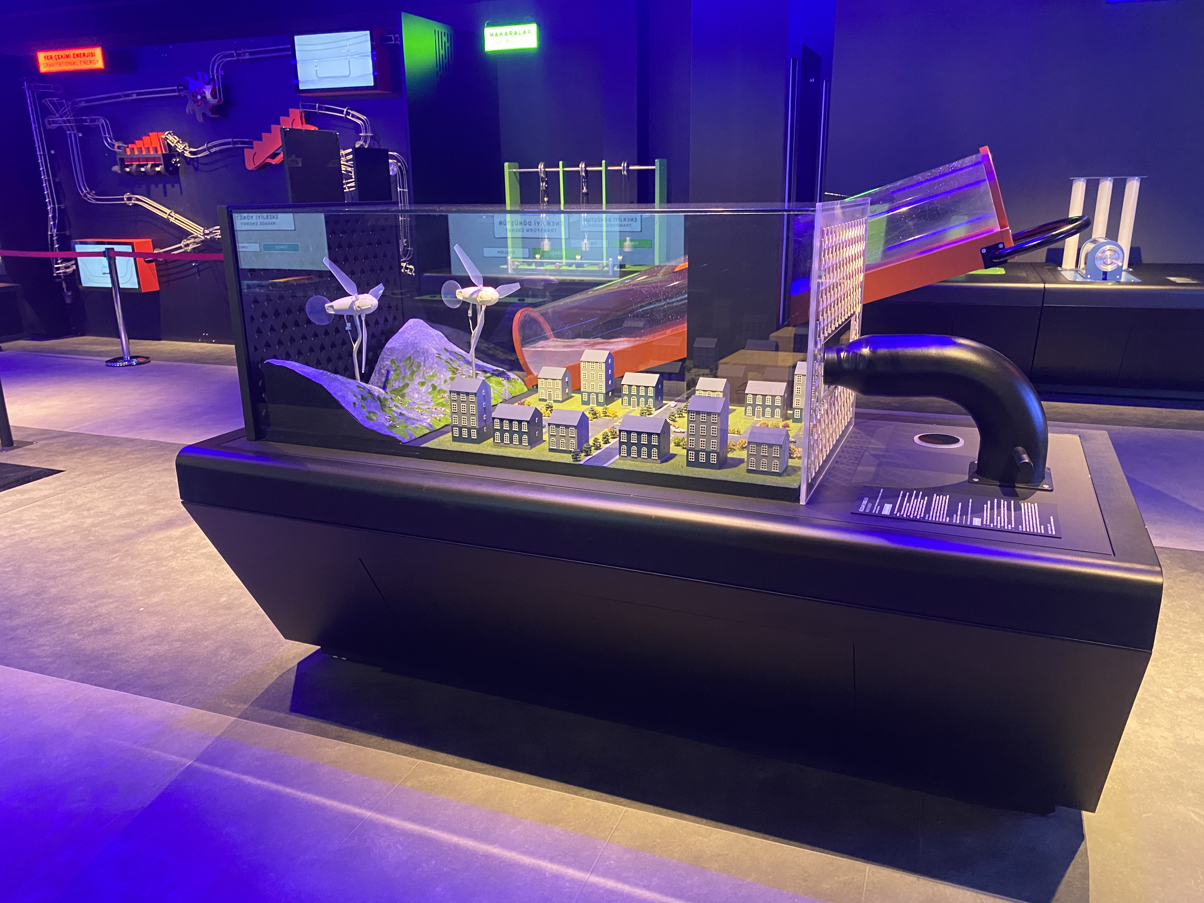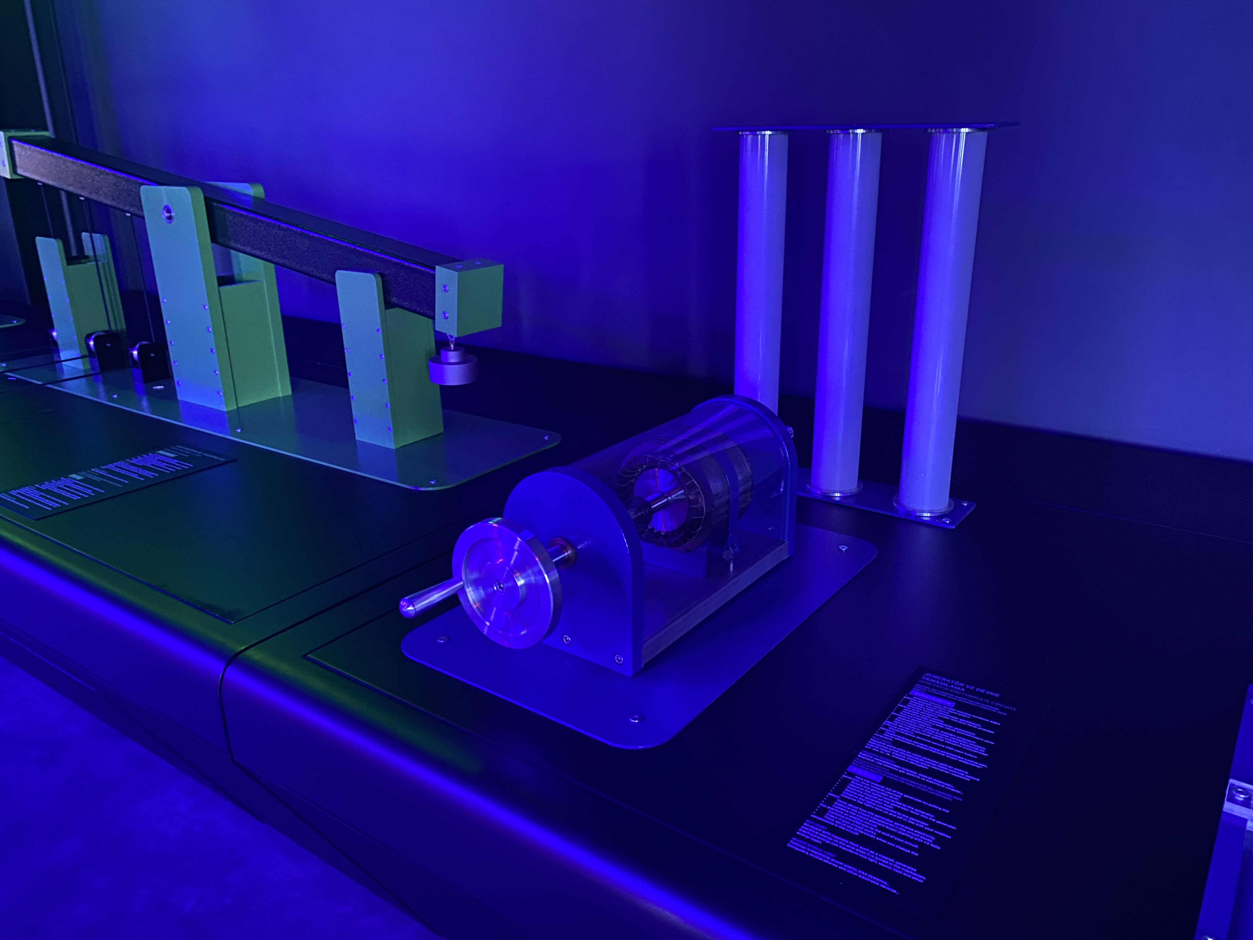 Ziyaretçi rotoru döndürmek için kolu çevirdiğinde, mıknatıs uçlu kollar serginin kenarına monte edilmiş bir dizi sabit elektromanyetik bobin üzerinde salınım yapar. Rotorun mıknatıs uçlu kolları elektromıknatısları geçerken bobinlerden elektrik üretilir. Her bobinin üzerindeki LED'ler, güç ürettiğini belirtmek için yanar. Ziyaretçi, jeneratöre bağlı bir ampul ve/veya fanı yakarak üretilen elektriği de görebilir.