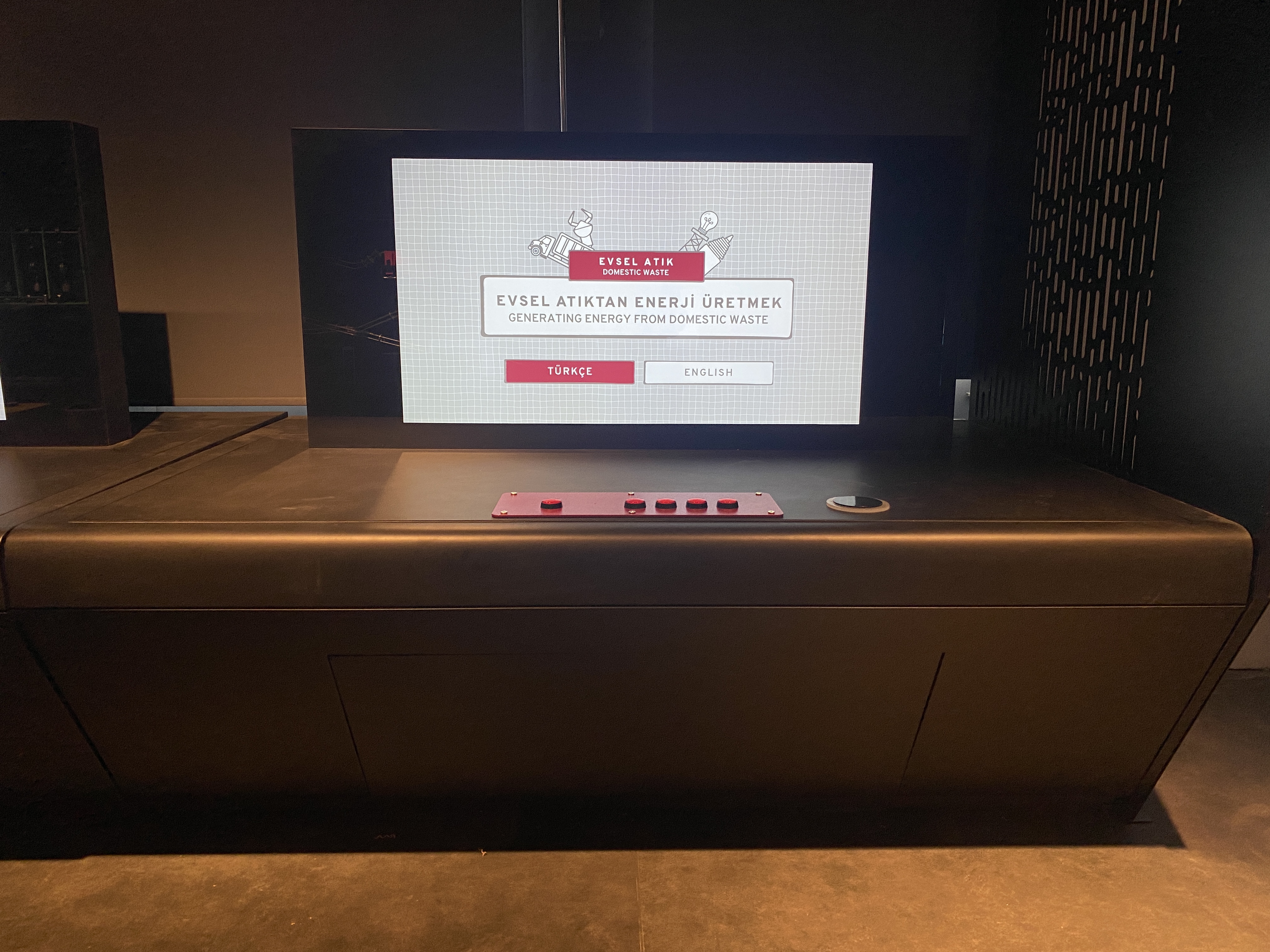 Ziyaretçi suyu doldurmak için pistonu yukarı ve aşağı hareket ettirir. Hareketle kazanılan enerjiyi düğmeye basarak harcar ve başka enerji türlerine dönüştürür.