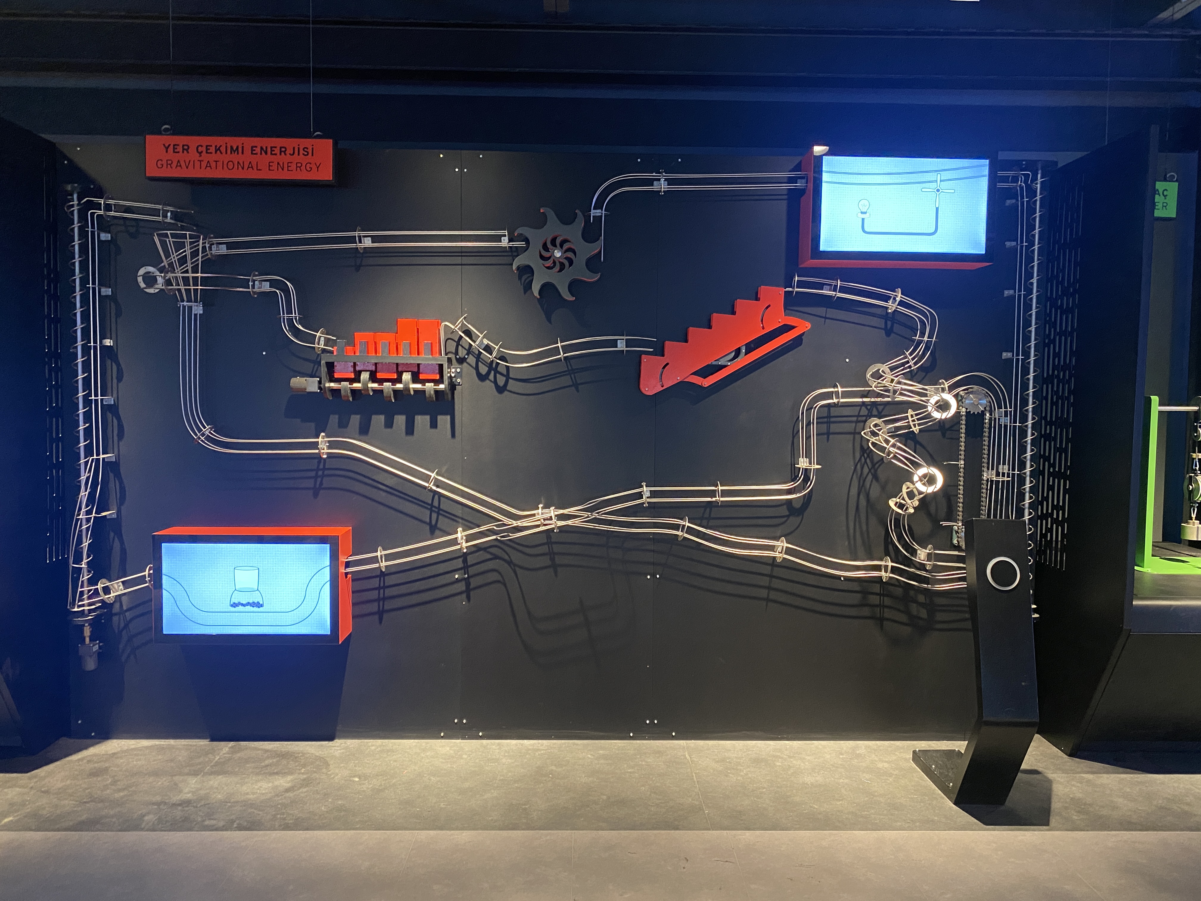 Ziyaretçi çarkı çevirerek topu harekete geçirir, top yerçekimi ve çarklar yardımıyla döngüsel olarak turu tamamlar.