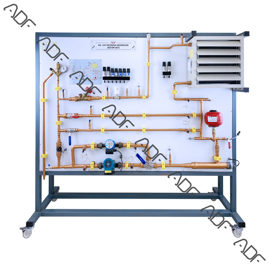 Eğitim seti, sirkülasyon pompası, elektrikli ısıtıcı, ısıyı dağıtmak için konvektör, çeşitli boru bölümleri, bağlantı parçaları ve güvenlik cihazları ile eksiksiz bir kapalı ısıtma devresi içerir. En önemli bağlantı elemanlarının kayıpları, yedi fark basınç sensörü kullanılarak belirlenebilir. Kontrol yanıtı ve enerji akışı, dört sıcaklık sensörü, bir akış hızı sensörü ve bir etkin güç sensörü kullanılarak çizilebilir. Klasik bir sirkülasyon pompası ile diferansiyel basınç kontrollü sirkülasyon pompasının özellikleri karşılaştırılabilir. Ölçülen değerler Ethernet üzerinden doğrudan bir PC'ye iletilir ve sağlanan yazılımla işlenebilir. Hem sirkülasyon pompaları, hem ısıtıcı hem de konvektör fanı PC üzerinden kontrol edilebilir.