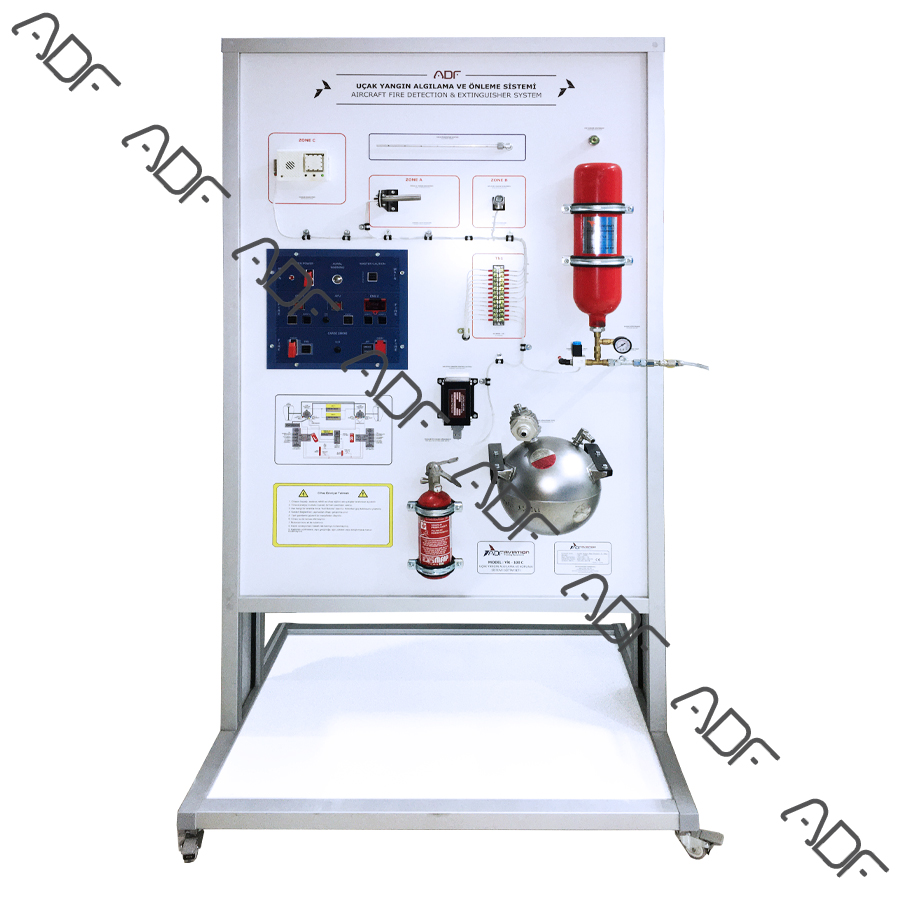 The extinguisher discharges shop air when the system is activated. The instructor can induce faults for the trainees to troubleshoot, providing hands-on experience in troubleshooting.