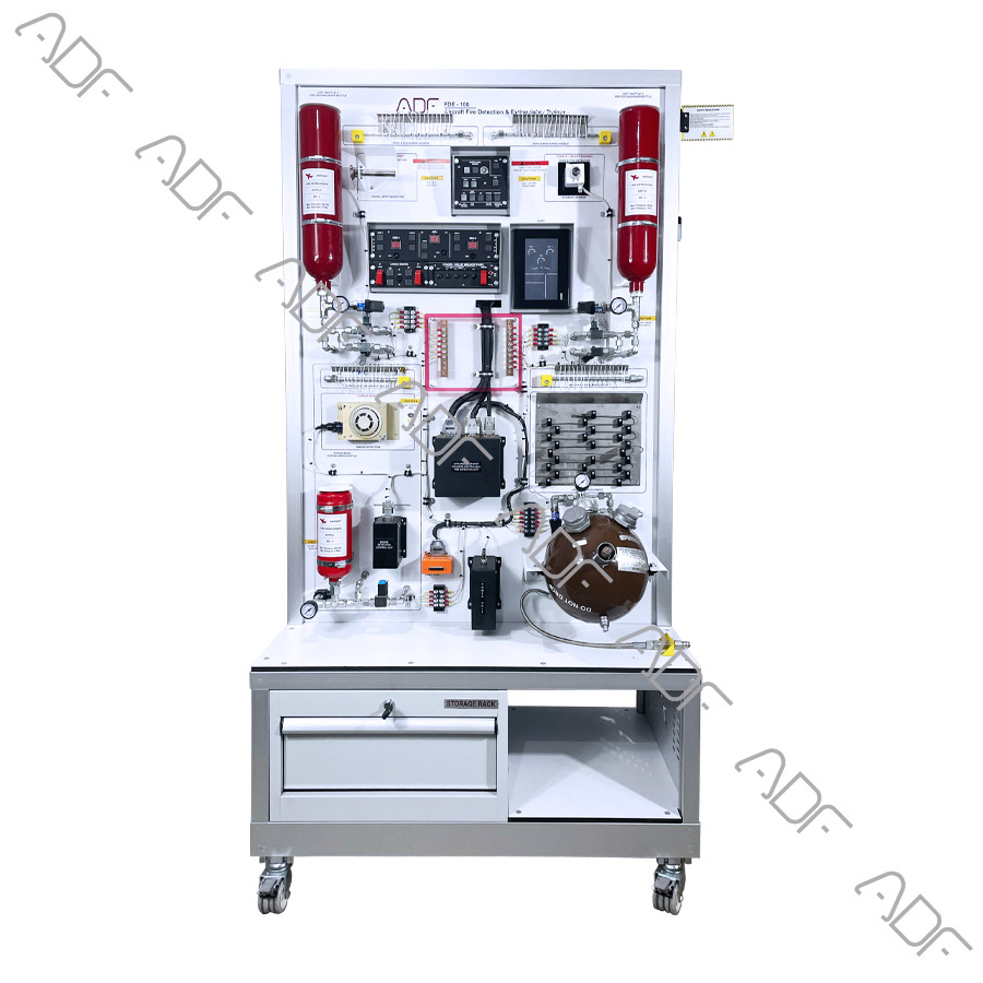 FDE-100V training set simulates a functional Airbus fire detection and extinguishing system. It incorporates the continuous loop and spot detectors with controls, indication and test circuits.